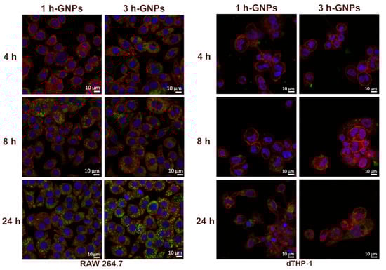 By using confocal microscopy, the localization of FITC–dextran-loaded GNPs inside the cells could be confirmed. Cell membranes were stained to distinguish between the nanoparticles inside the cells from those adhered to the cell surface. Most nanoparticles were scattered throughout the cell but not in the nucleus. FITC–dextran-loaded 1 and 3 h crosslinked GNPs (1 mg/mL) were incubated on RAW 264.7 and dTHP-1 cells for different incubation times (4, 8 and 24 h) before CLSM analysis. As shown in Figure 5, the cellular uptake of both GNP formulations exhibited obvious time-dependent behavior for 4, 8 and 24 h for both cell lines. However, GNPs interacted differently with RAW 264.7 and dTHP-1 cells represented by the larger extent of uptake by RAW 264.7 cells. Looking in detail into the impact of the elasticity on the particle uptake into RAW 264.7 macrophages, it can be observed that the harder particles already showed an uptake after 4 h, whereas only after 8 h an uptake for softer particles can be observed, which is further increased after 24 h. In the images obtained after 4 h of particle incubation of dTHP-1 cells, it was observed that the uptake of particles was low. However, for 8 and 24 h, it is clear that the particles are taken up in high amounts by the cells.