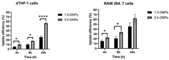 For quantitative analysis of the uptake, 5 × 104 cells/well of RAW 264.7 and dTHP-1 cells were seeded in 24-well plates and grown for 24 h. A total of 200 µL of a 1 mg/mL FITC–dextran-loaded GNP suspension was added to the wells and incubated for 4, 8 and 24 h. After incubation, cells were washed 5 times with HBSS. Then, cells were incubated with cell lysis buffer (9803, Cell signaling technology Europe, Leiden, The Netherlands) for 30 min. The fluorescence intensity of 150 kDa FITC–dextran-loaded GNPs was measured with fluorescence microplate reader (TECAN infinite m200, Männedorf, Switzerland) []. The uptake efficiency as a representation of the amount of overall uptaken particles was determined with the following equation: