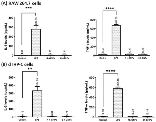 The effect of GNPs on IL-6 and TNF-α production in RAW 264.7 (A) and dTHP-1 (B) cells. Level of cytokine expression in the culture media was measured using a commercial ELISA kit. Data represent the means ± SD of three independent experiments. ** p = 0.0031, *** p = 0.0022, **** p < 0.001 in comparison to untreated controls; significant difference was determined using unpaired Student’s t-test. For positive control, RAW 264.7 and dTHP-1 cells were induced with 1000 and 200 ng/mL LPS, respectively. Untreated cells were used as negative control.