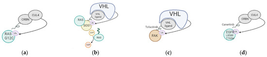 Mechanism of action of PROTACs tested in lung cancer. (a) Targeting of KRAS G12C oncogenic mutation using a Cereblon-based PROTAC; (b) Targeting of SOS1, cofactor of KRAS, using a VHL-based PROTAC; (c) Targeting of FAK using a VHL-based PROTAC; (d) Targeting of EGFR L858R and T790M using a CRBN-based PROTAC.