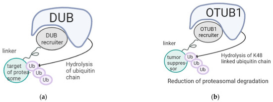 DUBTACs as promising anti-cancer approaches. (a) Mechanism of action of DUBTACs that hydrolyze pro-degradative ubiquitin chains attached to a target to reduce recruitment of the cargo protein to the proteasome, thus reducing its degradation. (b) Hypothetical design using DUBTACs to recruit OTUB1 as a strategy to stabilize tumor suppressors through deubiquitination of K48-bound ubiquitin chains.