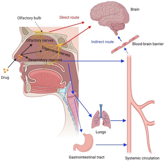 Following IN administration, drugs and genes can be absorbed into the systemic circulation in the respiratory region of the nasal cavity [103]. Systemic absorption can also occur via other routes, such as the lymphatic system, oral cavity, gastrointestinal tract, and lungs [47]. Simultaneously, there is direct nose-to-brain transport to deliver drugs and genes into the brain via IN administration [104]. Drugs and genes in the nasal cavity are distributed to the olfactory region, from where they can be transported to the brain mainly via an extraneuronal route along olfactory neurons in only a few minutes. This is the primary mechanism of the nose-to-brain transport of IN drugs and genes [87,101]. Other mechanisms occurring in the olfactory region include intraneuronal olfactory neuron endocytosis, supporting cell endocytosis, and intercellular transport across tight junctions, which may be time-consuming [105]. Drugs and genes can also be transported to the brain via the trigeminal nerve pathway by the extraneuronal and intraneuronal routes [87]. There is also an indirect pathway to deliver drugs and genes to the brain, through which the drugs and genes first enter systemic circulation after IN administration, cross the BBB, and reach the brain. This mechanism is less critical because the BBB contains efflux pumps, such as P-glycoprotein, that prevent most molecules from entering the brain [26,106,107]. The drug and gene transport routes from the nasal cavity to the systemic circulation and the brain are illustrated in Figure 2.