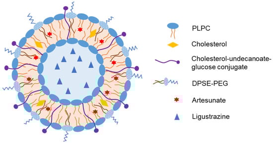 Representative structure of liposomes loaded with artesunate and ligustrazine with cholesterol–undecanoate–glucose conjugate to target glucose transporter 1 at the BBB for treatment of cerebral malaria [37].