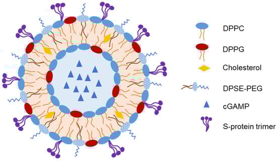 Liposomes have been used to encapsulate antigens or vaccine adjuvants to develop IN vaccines. An et al. developed an IN-liposome vaccine to control COVID-19 [73]. They first prepared liposomes containing 2′-3’-cyclic guanosine monophosphate adenosine monophosphate (cGAMP) in the core as adjuvants. The SARS-CoV-2 spike protein (S-protein) trimer was then adsorbed on the liposomes with 61.5% entrapment efficiency (Figure 5). In mice, a single IN-liposome administration elicited serum-neutralizing antibodies comparable to those elicited by other vaccine candidates. The IN-liposome vaccine also increased IgA responses in the nasal compartment and lungs and induced spike-specific T-cell response in the lungs and spleen.