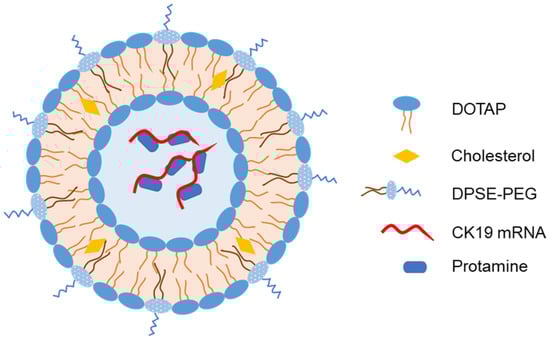 Representative structure of liposomes loaded with mRNA encoding cytokeratin 19 as an intranasal vaccine [71].