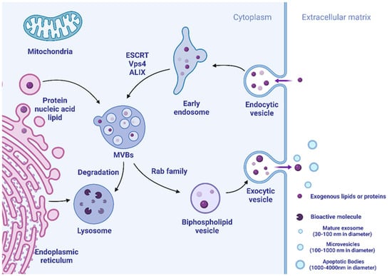 Exosomes are mainly formed by endocytosis of cell membranes, followed by converting to multivesicular bodies (MVBs) with dynamic subcellular architecture. Parts of MVBs could be fused to lysosomes, and their contents are degraded or recycled. The remaining MVBs may merge with the membrane followed by secretion to the extracellular matrix to form new extracellular vesicles including exosomes. The biogenesis mechanism of exosomes is controlled by related proteins, including annexin and tetraspanins (CD63). The endosomal sorting complex required for transport (ESCRT) is accepted as molecular media by which exosomes have specific cargo sorting functions []. Studies have shown that ESCRT-0, ESCRT-I, and ESCRT-II may be regulating cargo sorting, and ESCRT-III is involved in membrane endocytosis and exocytosis. Beginning with ESCRT-0, early endosomes for cargo-specific are initiated, recruited, and assembled to eventually form MBV [,]. In addition, Vps4 and ALIX also participate in cargo sorting and exosome formation [,]. Exosome formation steps are summarized in Figure 1.