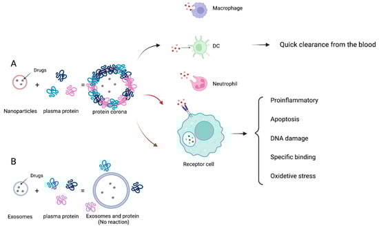The schematic representation of the biological reaction of the protein crown in blood circulation. (A) Various plasma proteins adsorb onto NPs immediately after the synthetic NPs enter the blood, resulting in rapid clearance and cytotoxicity; (B) exosomes weakly bind with the serum proteins, thereby enhancing the circulation time and decreasing the cytotoxicity.