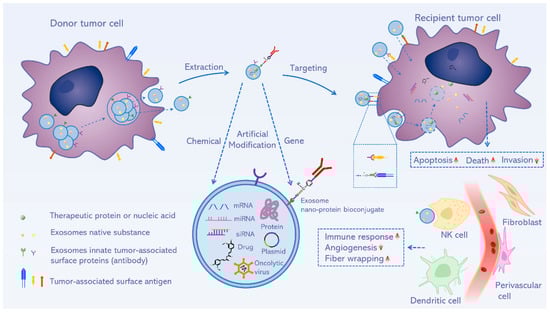 Exosomes rich in genetic material, proteins, and lipids may carry effective communication information for donor cells and target cells, which may build up the tumor microenvironment (TME) []. Tumor-derived exosomes (TDEs) were also found to have strong associations with TME and cancer initiation. Therefore, TDEs could be devised as natural drug carriers with higher cancer cell targeting and therapeutic efficacy, low toxicity, and permeability [].