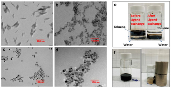 TEM images of iron oxide nanoparticles displaying monodispersed and diverse morphologies. (a) FeOOH nanorod precursors after hydrolysis of FeCl3; (b) Fe3O4 nanorods after reduction of FeOOH using branched PEI (B-PEI) and tetraethylene glycol (TEG) at 230 °C; (c) Fe3O4 nanospheres formed via thermal decomposition of metal-oleate precursors at 320 °C; (d) Fe3O4 truncated octahedrons formed via thermal decomposition reaction of Fe(acac)3, oleic acid, and trioctylamine (Scale bar: 100 nm); (e) the properties of nanoparticles before and after the surface functionalization using B-PEI 10K via a ligand exchange method; and (f) demonstration of the magnetic nature of the Fe3O4 nanoparticles using a strong static magnet.