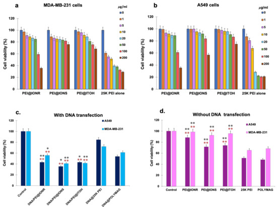 We checked the cytotoxicity of PEI@IONPs in comparison to 25,000-branched PEI (25K B-PEI) in A549 and MDA-MB-231 cells at different concentrations (Figure 2a,b). No obvious cytotoxicity of PEI@IONPs was observed for increasing concentrations ranging from 0 to 200 μg/mL in cell lines; on the other hand, the gold-standard transfection reagent PEI 25K alone was found to have cytotoxicity in cells with increasing concentration. Generally, the higher-molecular-weight PEI derivatives were shown to have increased toxicity compared to low-molecular-weight PEI [40]. PEI on its own exhibits some cytotoxicity [42], and the negligible or lower cytotoxicity of PEI@IONPs suggests that the polymer stays intact on the surface of the nanoparticles in cell media, which reduces the cationic and toxic charge when the PEI is adsorbed on the surface [43].