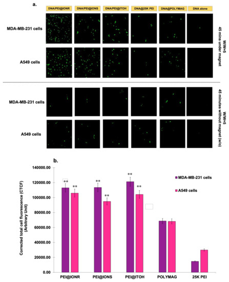 Transfection efficiency study, involving the delivery of plasmid DNA, using PEI@IONPs. (a) Expression of green fluorescent protein (GFP), observed through fluorescence microscope in MDA-MB-231 and A549 cell lines transfected with GFP-tagged miRNA34a intact pDNA using PEI@IONPs and incubated with and without (w/o) a static magnet, for 45 min, at a DNA/IONP weight ratio of 5 (W/W = 5), compared with PolyMag as a positive control. (b) Corrected total cell fluorescence (CTCF) of MDA-MB-231 and A549 cells calculated using ImageJ software. The results are represented as mean value ± standard deviation (n = 3, ** p < 0.01).
