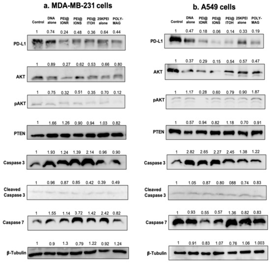 Western blot analysis for PD-L1 protein and its signaling pathways. After transfection with miRNA34a in the (a) MDA-MB-231 and (b) A549 cell lines, the results show the success and higher percentages of knockdown in PD-L1 protein levels after treatment with PEI@IONPs compared to PEI 25K alone. PD-L1 silencing is also seen with PolyMag treatment, mostly due to the cell cytotoxicity after treatment leading to lower concentrations of protein lysate. The signaling proteins AKT and pAKT are downregulated as they are responsible for promoting and regulating PD-L1 in cancer cells. PTEN is seen to be upregulated as it acts as a tumor suppressor for the PD-L1 gene. The apoptosis markers caspase 3, cleaved caspase 3, and caspase 7 show upregulation after transfection with miRNA34a/PEI@IONPs, inducing apoptosis in cancer cells. Protein expression was analyzed via ImageJ using the fold change method.