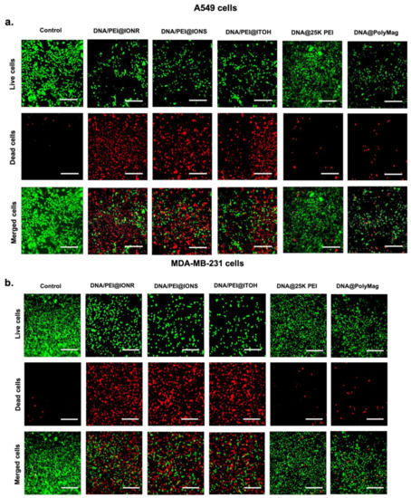 A549 and MDA-MB-231 cells (7 × 104 cells/well) were seeded into 12-well plates and incubated at 37 °C overnight; later, they were transfected with miRNA34a (3μg) using PEI@IONPs at a weight ratio of 5 (W/W = 5) and commercially available PEI and PolyMag, for 45 min under a magnetic array in a serum-free medium. The cells with the test samples were incubated in substituted DMEM containing 10% FBS for another 48 h. After incubation, the cells were washed twice with 1X PBS and stained with calcein-AM (Sigma Aldrich) and propidium iodide (PI) (Sigma Aldrich) (according to the protocol given by Cellink accessed on 1 June 2022 onwards (https://www.cellink.com/wp-content/uploads//2019/03/Viability-Protocol-Calcein-AM-PI_07-Mar-2019.pdf).