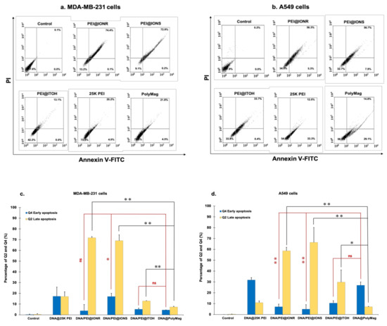 A549 and MDA-MB-231 cells were plated at a density of 1 × 105 cells/well in 6-well plates for the apoptosis assay. The cells were transfected with miRNA34a (3μg) using PEI@IONPs at a weight ratio of 5 (W/W = 5) and commercially available PEI and PolyMag, for 45 min under a magnetic array in a serum-free medium, and incubated in substituted DMEM containing 10% FBS for another 48 h. The cells were collected after 48 h of incubation and analyzed using an Annexin V-FITC apoptosis detection kit according to the manufacture’s protocol. Briefly, the cells were washed with 1X PBS and trypsinized for collection, and the cell pellets were collected via centrifugation at 1500× g rpm for 5 min. The cell pellets were incubated with Annexin V-FITC/PI solution at room temperature for 30 min and assayed using a flow cytometer (Beckman Coulter) and WinMDI software.