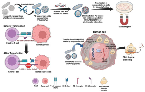 Illustration of the synthesis of iron oxide nanoparticles (IONPs) with three different morphologies, and surface functionalization with positively charged branched polyethylenimine (B-PEI). Plasmid DNA (pDNA) with miRNA34a inserts is encapsulated on the surface of B-PEI-coated IONPs (PEI@IONPs) with electrostatic interactions as DNA is negatively charged. The PEI@IONPs and pDNA magnetoplexes are transfected into cancer cells using a static external magnet to study gene delivery efficiency. Upon PD-L1 interaction with the programmed cell death protein 1 (PD-1) on T cell surfaces, the T cells become inactive and unable to help the immune system to fight against tumor growth. The PD-L1 present on the tumor cell surfaces is targeted by miRNA34a-encoded pDNA using PEI@IONPs. pDNA internalization and release inside the cell happen mostly via the enhanced permeability and retention (EPR)/proton sponge effects, and the desired PD-L1 gene silencing takes place gradually due to various factors inside the cell.