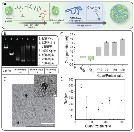 After confirming and optimizing c−EGFP modification, incubated c−EGFP samples were then incubated with increasing amounts of the PONI Guan (55 kDa) polymer according to the Guan/Protein ratio. The assemblies were run on native PAGE retardation gel. We found that a minimum Guan/Protein ratio of 38 was necessary to fully complex c−EGFP (Figure S2). The sizes of the assemblies formed at different Guan/Protein ratios were then measured by dynamic light scattering (DLS) (Figure 1E). It was observed that for most formulations, the size of the particles remained between 100 and 300 nm (Figure 1E), with the smallest particles being those formulated at Guan/Protein = 150, which further corroborated with the TEM results (Figure 1D). Importantly, the formed nanocomposites displayed polydispersity index values of 0.6 and 0.8 at Guan/Protein ratios of 37.5 and 75, respectively, and of 0.2 at Guan/Protein ratios of 150 and higher. Hence, the Guan/Protein ratio of 150 was selected for future nanocomposites, as it yielded small-sized, homogeneous complexes.