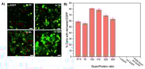 Representative confocal images of HEK-293T and quantification of delivery by flow imaging cytometry after 24 h incubation with PONI Guan/c-EGFP assemblies. (A) Delivery of c-EGFP delivery formulated at Guan/Protein ratio 150 (scale bar: 25 µm) at different time points. Diffuse fluorescence and nuclear access, where appropriate, signals cytosolic access. (B) Quantification of the percentage of cells delivered with EGFP at different Guan/Protein ratios. Data are an average of replicate measurements (n = 3). Error is the standard deviation by population.