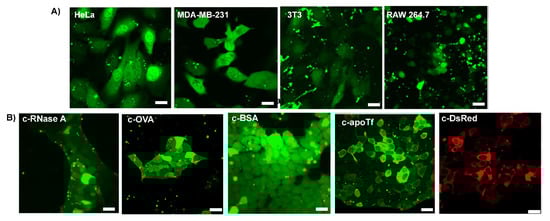 Representative confocal images of delivery with different anhydride-modified proteins after 24 h incubation. The assemblies were delivered at a Guan/Protein ratio of 150 (scale bar: 25 µm). (A) Cytosolic delivery of c−EGFP to different cell lines. (B) Cytosolic delivery of different proteins to HEK-293T cells.