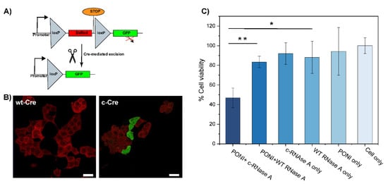 Finally, we applied our co-engineering approach to the delivery of active proteins, Cre recombinase, and RNase A. Cre recombinase is an enzyme that catalyzes the specific recombination between two consensus DNA sequences (LoxP) in the nucleus. It is a popular tool in genome engineering where it is used in a vast variety of organisms [,]. To evaluate the activity of c−Cre, we used a Cre reporter HEK-293T cell line which expresses DsRed. A Cre-mediated recombination would excise the DsRed DNA coding sequence and proceed the STOP codon to trigger the expression of GFP, effectively switching the cells from red to green fluorescence (Figure 4A). After 48 h of incubation with c−Cre/PONI nanocomposites (Guan/Protein = 150), we observed that 20% of cells had shifted from expressing DsRed to expressing GFP (Figure 4B). We anticipate that further optimization of the conjugation of Cre would lead to a better compromise between sufficient modification (to allow delivery) and minimal modification (to preserve the enzymatic activity).