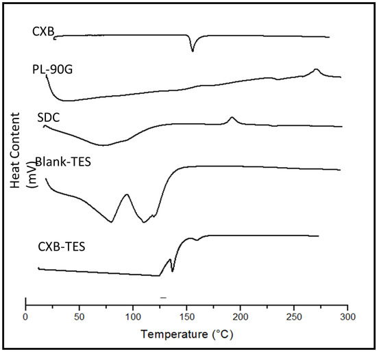 Figure 1 displays the thermograms of pure CXB powder, PL-90G, SDC, blank-dried TES, and the selected CXB-TES. The DSC scan shows CXB endothermic peak at 163.3 °C approximated to the melting point of pure CXB [64], confirming its crystalline structure. The DSC thermogram of PL-90G displays a phase transition temperature at 41.8 °C [28]. The thermogram of SDC demonstrating a broad endotherm initiated at 110.82 °C might be due to the loss of water molecules, and an exo thermic recrystallization peak existed at 238.0 °C [65]. On the other hand, the selected CXB-TES (F4) shows a decreased intensity of the distinctive peak of the drug. This observation may confirm the entrapment of CXB in lipid vesicles following interactions between the drug and PC and SDC. Such interactions as hydrogen bonding, Van der Waal’s attraction, or dipole-dipole forces might illustrate the formation of homogenous vesicle shape and structure with enhanced physical stability, as previously reported [28,53].