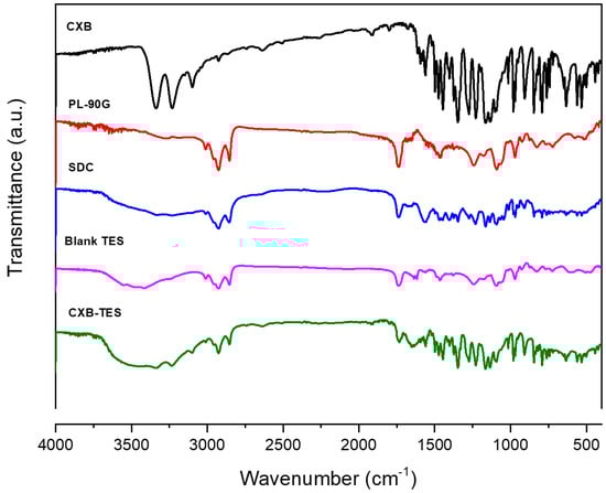 FT-IR spectra of CXB, phospholipone (PL-90G), sodium deoxycholate (SDC), blank TES, and the selected CXB-TES (F4).