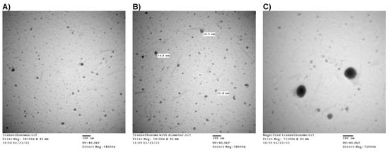 Optimized CXB-TES were imaged employing a transmission electron microscope (TEM) (JEOL 100 CX, Tokyo, Japan) at 80 kV accelerating voltage. The sample was treated by adding 20 µL of the TES suspension onto a Formvar-coated 300 mesh grid stabilized with evaporated carbon film for 1 min. A filter paper was used to remove the excess sample. The aqueous solution of uranyl acetate (2% w/v) was used to negatively stain the vesicles by adding 20 µL for a few seconds, followed by drying overnight at room temperature. Images were captured using the AMT-700 camera (Advanced Microscopy Techniques, Woburn, MA, USA).