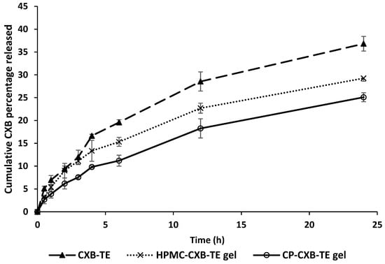The in vitro release study of CXB from the optimized TES formulation (F4) was carried out in PBS (pH 6.8, containing 1% w/v SLS) at 37 ± 0.5 °C, employing a modified dialysis membrane diffusion technique [20,66]. The in vitro release profile of CXB-TES was compared with that of CXB-TES-loaded HPMC-based gel and CXB-TES-loaded Carbopol-934-based gel (Figure 4). Generally, CXB-TES suspension showed a higher in vitro release than the hydrogel preparations.