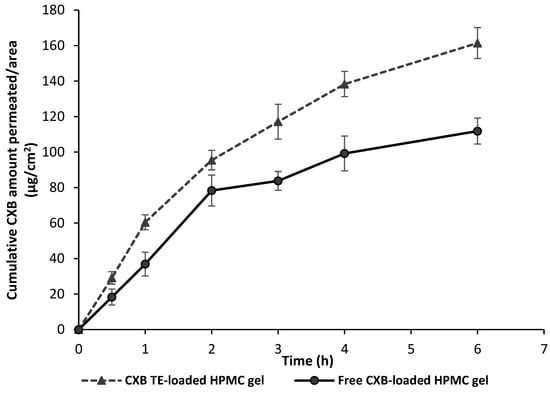 Ex-vivo permeation profile of selected CXB transethosomes-loaded HPMC-based hydrogel (CXB-TES-HPMC gel), in comparison to free CXB-loaded HPMC hydrogel in phosphate buffer (pH 6.8, 1% w/v SLS) at 37 °C. Data are expressed as mean ± S.D. (n = 3).