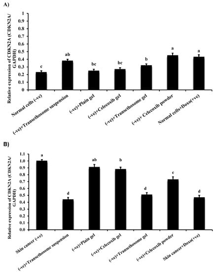 Gene expression analysis was performed on normal and cancerous skin cell lines using skin cancer-related genes, namely the cyclin-dependent kinase inhibitor 2A (CDKN2A) gene (Figure 6a,b). The results revealed that the expression levels of the CDKN2A gene were increased significantly (p ≤ 0.05; ANOVA/Tukey) in normal skin cell lines treated with TES suspension and CXB powder, respectively, compared with untreated normal skin cell lines (Figure 6a). Moreover, the expression levels of the CDKN2A gene were elevated considerably (p ≤ 0.05; ANOVA/Tukey) in normal skin cell lines treated with doxorubicin compared to negative control normal cell lines. In addition, treatment of normal skin cell lines with TES hydrogel increased the expression levels of the CDKN2A gene compared with negative control normal cell lines. Still, the expression levels of the TES gel-treated group were lower than those in the TES suspension and CXB powder groups.