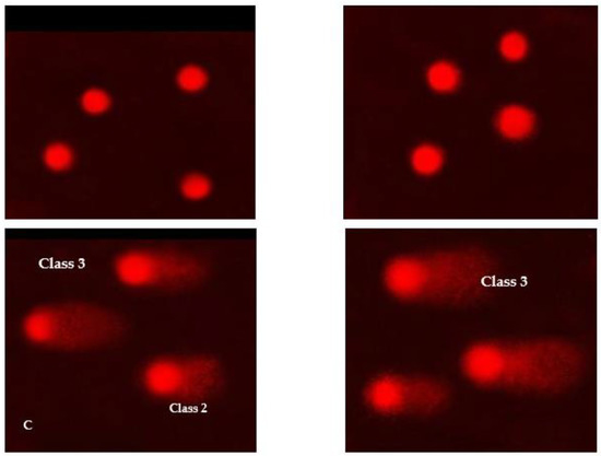 The comet assay was performed using healthy and tumor skin cell lines. The test was conducted as described previously [48]. Briefly, after the cells were exposed to the tested formulations, the cells were collected and trypsinized. The centrifuged cells (1.5 × 104 cells) were suspended in 0.75% low-gelling-temperature agarose. The cells suspended in agarose were pipetted onto dry pre-coated microscope slides. Then, the slides were immersed in lysing solution at 50 ± 0.5 °C (0.5% SDS, 30 mM EDTA, pH 8.0) for at least 4 h, followed by washing overnight using Tris/borate/EDTA buffer, pH 8.0, at room temperature. Afterward, samples were transferred for electrophoresis at 0.6 V/cm for 25 min, then stained with propidium iodide. The slides were analyzed using a fluorescence microscope equipped with a CCD camera. For slide scoring, Comet images (150 separate images) were analyzed for the percentage of DNA in the comet tail, the tail moment, and the content of DNA. The percent of DNA in the comet tail (100 tested cells/sample) was used to indicate the quantity of DNA damage. A visual score was assigned to each cell based on comet tail length migration and the relative proportion of DNA in the nucleus: class 0 (undamaged DNA, no tail), class 1 (very little DNA damage, comet tail with a length less than the diameter of the nucleus), class 2 (moderate DNA damage, tail lengthened between 1× and 2× the nuclear diameter), and class 3 (highly damaged DNA, tail longer than 2× the diameter of the nucleus) [49].