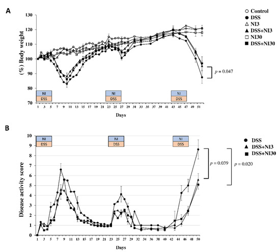 - Kim, D.; Koo, J.S.; Park, J.H.; Hwang, S.H.; Lee, D.; Choe, J.W.; Hyun, J.J.; Jung, S.W.; Jeen, Y.T.; Lee, S.W. The protective effect of necrosis inhibition on acute murine colitis induced by dextran sulphate sodium. J. Crohn’s Colitis 2019, 13, S116. [Google Scholar] [CrossRef]