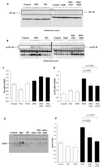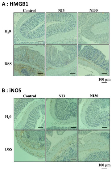 - Kimura, H.; Miura, S.; Shigematsu, T.; Ohkubo, N.; Tsuzuki, Y.; Kurose, I.; Higuchi, H.; Akiba, Y.; Hokari, R.; Hirokawa, M.; et al. Increased nitric oxide production and inducible nitric oxide synthase activity in colonic mucosa of patients with active ulcerative colitis and Crohn’s disease. Dig. Dis. Sci. 1997, 42, 1047–1054. [Google Scholar] [CrossRef]