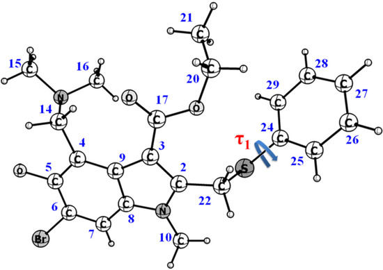 According to the Cambridge Crystallographic Data Centre [https://www.ccdc.cam.ac.uk/ (accessed 31 October 2022)], conformations of umifenovir molecules comprising the polymorph and solvates are characterized by the dihedral angle τ1 (C22–S1–C24–C29) (see Figure 1 and Table S3). Depending on the angle τ1 and the orientation of the phenyl group, with respect to the indole moiety, six possible conformers can be observed [27,28]; they can be divided into two groups, based on the angle values: S having τ1 about −100° ± 20 and P with τ1 ≈ 170°.