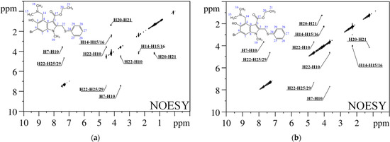 The peculiarity of the present study is that the conformer fractions in CDCl3 and DMSO-d6 were calculated based on the experimental interatomic distances obtained in X-ray studies, assumed to be the most probable in condensed matter. Distances in the dissolved molecules were determined from experimental cross-relaxation rates, obtained by analysis of the NOESY spectra (Figure 2). Five pairs of cross-peaks in the NOESY spectrum correspond to intramolecular distance within 5 Å (H7–H10, H10–H22, H14–H15/H16, H20–H21 and H22–H25/H29).