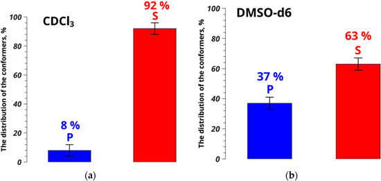 Thus, the distance between atoms H22 and H25/H29, characterizing changes in the umifenovir conformers, is 3.33 ± 0.05 Å in chloroform, and is similar to the value of 3.54 ± 0.12 Å found for solvates of umifenovir determined by XRD [27]. The difference of 0.21 Å is within the experimental accuracy level. At the same time, the polymorphic form consisting of conformers P has the distance H22–H25/H29 of 2.59 ± 0.08 Å. This differs from the value found from the NOESY experiments performed in chloroform by 0.74 Å, which is four times the experimental error. The results show that conformers S dominate over P as 92% to 8% for CDCl3, while in DMSO the corresponding populations ratio is 63% to 37% (Figure 3). Thus, formation of solvates of umifenovir in DMSO is unlikely, whereas chloroform is the preferred medium for screening of the solvate forms.
