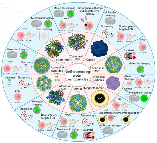In this review, we are focused on the currently existing platforms for self-assembling protein nanoparticles for creating new-generation nanomedicines based on transferrin, lactoferrin, casein, lumazine synthase, albumin, ferritin, and encapsulin proteins, as well as on proteins from magnetosomes and virus-like particles (Figure 1). The mentioned self-assembling proteins were used for the design of TDD systems for bioimaging purposes and different therapeutic approaches, such as chemotherapy, gene delivery, photodynamic therapy, or photothermal therapy.