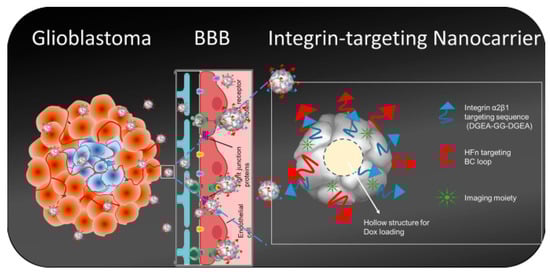 Nonetheless, the surface of ferritin nanocages could be modified through either genetic engineering or chemical conjugation techniques to enhance their ability to specifically target cells or provide dual-targeting ability. Particularly, using genetic engineering, different proteins such as antibodies or peptides could be introduced on the surface of nanoparticles. For example, the dual-targeting ability was achieved in HFn nanoparticles genetically fused with an integrin α2β1 targeting ligand (2D-HFn). Unlike most drug platforms, HFn can cross the blood–brain barrier (BBB), whereas the integrin α2β1 targeting ligand specifically binds to integrin α2β1 overexpressed in glioma (Figure 2) [54,55,56]. As a result, the flow cytometry test demonstrated that fluorescently labeled with fluorescein isothiocyanate (FITC) 2D-HFn particles traversed the BBB and bound to U-87MG cells. The same effect was achieved in vivo, which was analyzed by MRI and IVIS imaging of IRDye-800-2D-HFn injected into orthotopic tumor-bearing animals. Doxorubicin-loaded 2D-HFn caused the death of 69% of U-87MG cells compared to 29% of cells that died from free doxorubicin. After three weeks of Dox-loaded 2D-HFn treatment on U-87MG tumor-bearing mice, the average tumor weight was less than 0.2 g. In the orthotopic glioma brain tumor model, tumor volume after treatment with Dox-loaded 2D-HFn reached 7.53 ± 3.16 mm3 [57].