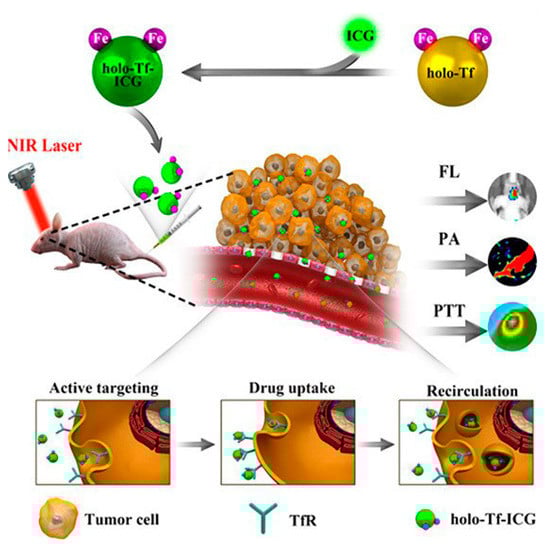 Schematic representation of Tf-NP-based targeted delivery of indocyanine green (ICG) for PTT. Reprinted with permission from [72]. Copyright 2017, American Chemical Society.