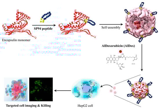 Successful use of encapsulin for in vitro targeted drug delivery and imaging has been recently demonstrated [74,75,76,77]. Encapsulin has a flexible surface loop and this loop can be used for the insertion of small peptides using genetic engineering techniques. The loop can be genetically modified to display a peptide tag (such as SpyTag) for a post-translational protein ligation reaction with its protein partner (SpyCatcher). The SpyTag/SpyCatcher ligation system is further discussed in detail in Section 2.12.2. With the desired modification of SpyCatcher and Encapsulin-SpyTag, such “molecular superglue” would find versatile applications: two-step targeted drug delivery, targeted bioimaging, enzyme immobilization, etc. [75]. The encapsulin’s loop can be genetically modified, e.g., to display SP94, a target peptide binding to hepatocellular carcinoma cells (Figure 4). These nanoparticles were conjugated with a prodrug, aldoxorubicin (SP94-Encap-AlDox). To confirm targeting ability, SP94-modified encapsulin was conjugated with fluorescein-5-maleimide possessing fluorescent properties. Confocal microscopy showed that these nanoparticles were specifically bound to HepG2 cells. In vitro cytotoxicity of SP94-Encap-AlDox was found to be, in a dose-dependent manner, as free Dox [74]. In another work, the encapsulin surface was functionalized with the anti-HER2 designed ankyrin repeat protein (DARPin9.29). Obtained nanoparticles were loaded with a mini Singlet Oxygen Generator (miniSOG) that produces the cytotoxic reactive oxygen species under blue light irradiation [78]. After incubation of the nanoplatforms with SK-BR-3 cells in the presence of light, 48% of apoptotic cells were identified by flow cytometry [76]. Considering all applications mentioned above, encapsulin as a targeted drug delivery platform anticipates highly promising efficacy in vivo.