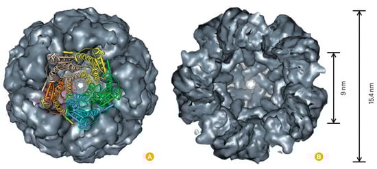 Schematic illustration of lumazine synthase nanoparticle: surface and ribbon diagram (PDB: 1HQK) looking down the five-fold symmetry axis (A) and the interior space of the protein cage (B). Reproduced with the permission from [138] (CC BY-NC 4.0).