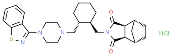 Lurasidone hydrochloride (LRD) is an atypical antipsychotic drug approved by the FDA for treating schizophrenia and bipolar disorder (manic depression) in adults and adolescents []. It has been reported to be capable of stabilizing schizophrenia after a short-term usage (~6 weeks) by clinical studies in adult patients using a placebo-controlled, randomized, and double-blinded scheme []. It has also shown anxiolytic and antidepressant effects through the combined blockade of the dopamine type-2 (D2) and serotonin type 2A (5-HT2A) receptors []. It presents low extrapyramidal activation and neuromotor detriment, along with low central nervous system depression, thus showing few adverse effects. In addition, it has minimal muscarinic and α1 receptor inactivation through blockade []. This profile suggests a minor propensity towards weight gain and metabolic dysfunction, while it has high potential for improving cognitive deficits related to schizophrenia [].