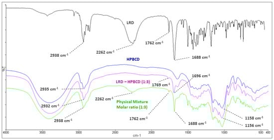 Infrared spectroscopy of LRD (black), HPBCD (blue), physical mixture (green), and LRD–HPBCD (1:3) complex (pink).