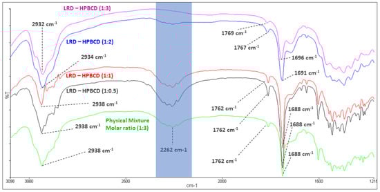 The mean absorption bands of HPBCD were 2935 and 1158 cm−1, associated with the C-H alkyl backbone and C-O, respectively (blue line, Figure 3). These were observed at 2932 and 1156 cm−1 in the LRD–HPBCD (1:3) complex (pink line), respectively, indicating potential changes in the host structure when the drug is included. In the case of LRD, absorptions were observed at 2938, 2262, and 1762–1688 cm−1, assigned to the C-H alkyl group, N-H overtone salt, and C=O in the isoindole-1,3-dione ring, respectively. These signals appeared at the same wave numbers in the physical mixture (green line), but in the LRD–HPBCD (1:3) complex the carbonyl group was displaced to 1769–1696 cm−1 and the second band disappeared, indicating that the drug lost its crystalline structure when the inclusion complex was formed. This last change was also reported when synthesizing co-amorphous complexes of LRD [,]. Previously, for LRD–BCD complexes obtained by spray-drying and kneaded solid dispersion, only in the first method was a similar result observed []. In our case, with the slurry method, only the higher ratios presented this phenomenon, with a diminished band in the blue line and absent in the pink line (Figure 4). At the other ratios (red and black lines), the band was present, indicating partial incorporation of the drug in the HPBCD and a remaining crystalline interaction with the hydrochloride salt. The alkyl and carbonyl groups were not displaced.
