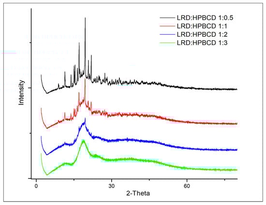 The diffraction patterns of complexes are shown in Figure 5. At the 1:2 and 1:3 LRD–HPBCD ratios, the spectra did not have significant peaks, indicating the amorphous nature of the solid. This was consistent with the disappearance of the band at 2262 cm−1 in the IR analysis shown in Figure 4. However, crystalline signals of the drug were observed in the 1:0.5 and 1:1 LRD–HPBCD complexes, resulting in a partial encapsulation. In another study for BCD–LRD, the kneading method resulted in a crystalline solid, while the spray-drying method resulted in an amorphous product [].