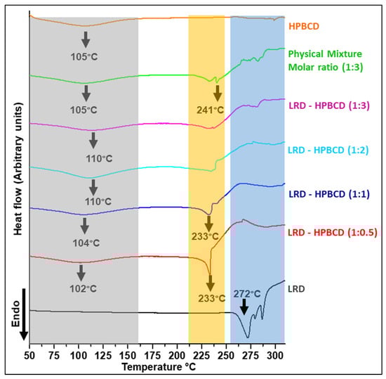 DSC curves of LRD–HPBCD complexes, LRD, HPBC, and PM. The grey band highlights the desolvation, the orange band shows the crystalline transition, and the blue band represents the crystalline phase of the drug.