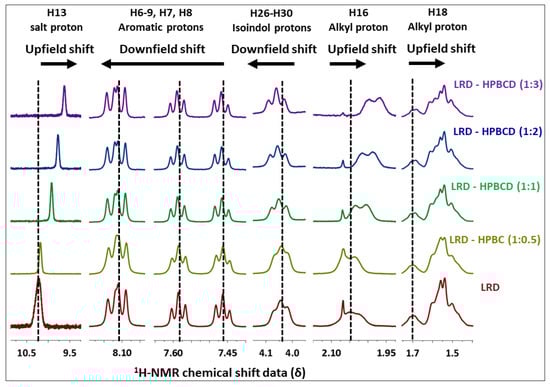 Changes in the chemical shifts were observed in different complexes (Figure 7), and the main 1H-NMR signals are summarized in Table 3. The salt and alkyl proton (H16–H18) had upfield shifts of Δδ = −0.678, −0.082, and −0.010 from LRD to LRD–HPBCD (1:3), indicating a cycloalkyl moiety interaction between the drug and the host. In the isoindole-1,3-dione group, downfield shifts were observed in the H26–H30 protons with Δδ = 0.017, suggesting the incorporation of the ring in the cavity. Aromatic protons (H6–H7–H8–H9) had the fewest downfield shifts, with Δδ = 0.005 from LRD to LRD–HPBCD (1:3), indicating a weak interaction with HPBCD. All of these results suggest the interaction of the drug with more than one host molecule and the formation of a higher-order complex [,]. For BCD, the formation of a 1:1 LRD–BCD complex through aromatic interactions with the benzothiazole ring was reported [].