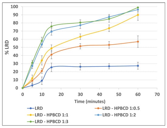 An amount of each complex equivalent to 20 mg of LRD was accurately weighed and manually encapsulated in gelatin capsules of size 1. Then, the dissolution testing was carried out in an apparatus II (paddle method) using a Distek dissolution system model 2500i (Distek, Inc., North Brunswick Township, NJ, USA) with 900 mL of citrate–phosphate buffer pH 3.8 (37 °C) and the paddle rotating at 50 rpm, according to the FDA’s recommendations []. Each capsule was added to the vessel with a sinker, and aliquots were withdrawn at 5, 10, 15, 30, 45, and 60 min of the test. Each sample was filtered with a PVDF 0.45 µm syringe filter (Merck Millipore, Darmstadt, Germany) and analyzed by HPLC according to the conditions described in Section 2.9.