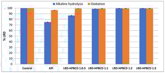 Alkaline forced degradation was carried out with LRD and the complexes. An equivalent amount of 10 mg of LRD was added to a glass vial with cap. Then, 1 mL of NaOH 0.1 N was added, and the vial was capped and shaken for 120 min at 80 °C. At the end, each sample was neutralized with 1 mL of HCl, completed to 10 mL with solvent mix (ACN:Water 1:1), filtered with a PVDF 0.45 µm syringe filter (Merck Millipore, Darmstadt, Germany), and analyzed by HPLC according to the conditions described in Section 2.2. For oxidative stress, an amount equivalent to 10 mg of LRD was added to a glass vial with cap, 1 mL of H2O2 15% v/v was added, and the vial was capped and shaken for 24 h at 40 °C. At the end, each sample was completed to 10 mL with solvent mix (ACN:Water 1:1), filtered with a PVDF 0.45 µm syringe filter (Merck Millipore, Germany), and analyzed by HPLC according to the conditions described in Section 2.2.