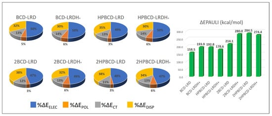 Cyclodextrins are cyclic oligosaccharides formed by 6–8 glucopyranose units, bonded by an α-1–4 glycosidic bond []. This macrocycle adopts a spatial disposition that provides a hydrophobic cavity and a hydrophilic outer surface responsible for its aqueous solubility []. The primary and secondary hydroxyls on the large and small edges of the macrocycle are able to favorably interact with water molecules. However, the main feature of cyclodextrins is given by the non-polar character of the central cavity, which enables binding of hydrophobic molecules such as drugs, where the water displacement is thermodynamically favored because of their low interaction strength with the inside of the macrocycle []. Normally, the nature of the host–guest interactions involves charge transfer, electrostatic interaction, dispersion forces (Van der Waals), hydrogen bonds, and conformational release of tension [,,]. Another interesting property of the host–guest chemistry of cyclodextrins includes their ability to form complexes of different ratios []. These properties have attracted the attention of the pharmaceutical industry, where they have been incorporated as excipients []. Their main advantages are their high stability under light, heat, and oxidation, their biocompatibility, the reduction in irritant effects on tissues caused by some drugs, and the decrease in flavor and smell, improving the organoleptic properties of drugs.