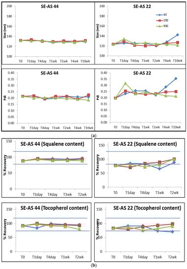 Both SE-AS 44 and 45 showed sizes closest to AS03 and PdI values less than 0.3, which fitted our criteria. These emulsions were then filtered as described previously to evaluate the size post-filtration. Interestingly, SE-AS 45 showed a bimodal size distribution (graph not shown) and increased PdI post-filtration (Table 2). However, SE-AS44 maintained size and showed similar PdI post-filtration (Table 2, Supplementary Figure S4). Further optimization of SE-AS 44 was performed using excipients such as TPGS and poloxamer 188, but the size and PdI did not further improve. In summary, SE-AS 44 was the most optimized emulsion with %v/v ratio of 60:15:25 Squalene:α-tocopherol:Polysorbate80, as it showed comparable size pre- and post-filtration and maintained the content of the oils within the range of 100 ± 20%. This emulsion was further evaluated for stability at different temperatures for 2 weeks.